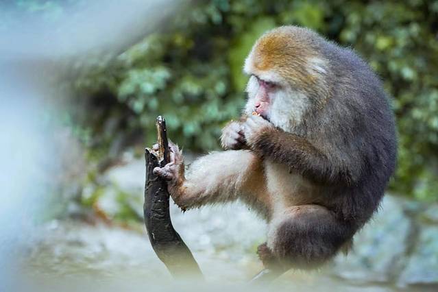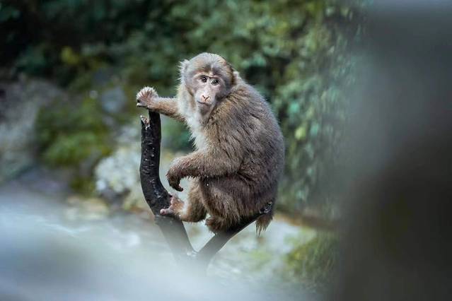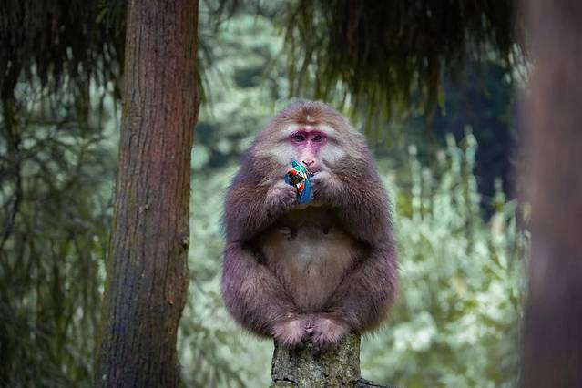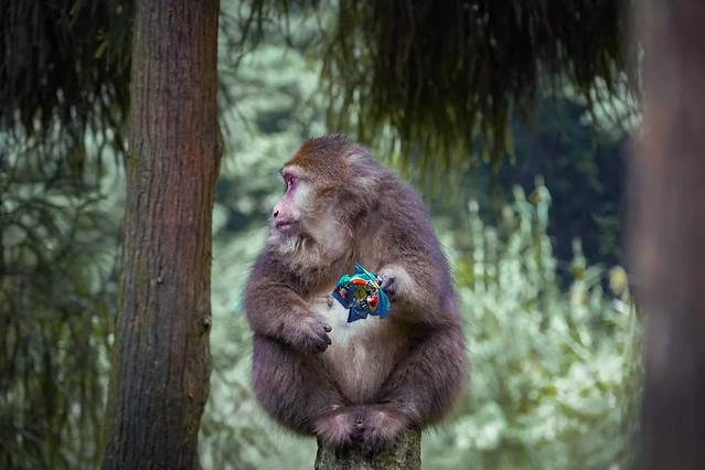 猴子自然就成了这里的主角,你看它们一个个形态各异,有坐在树上的,有正在吃东西的,红彤彤的脸颊在森林间格外显眼。