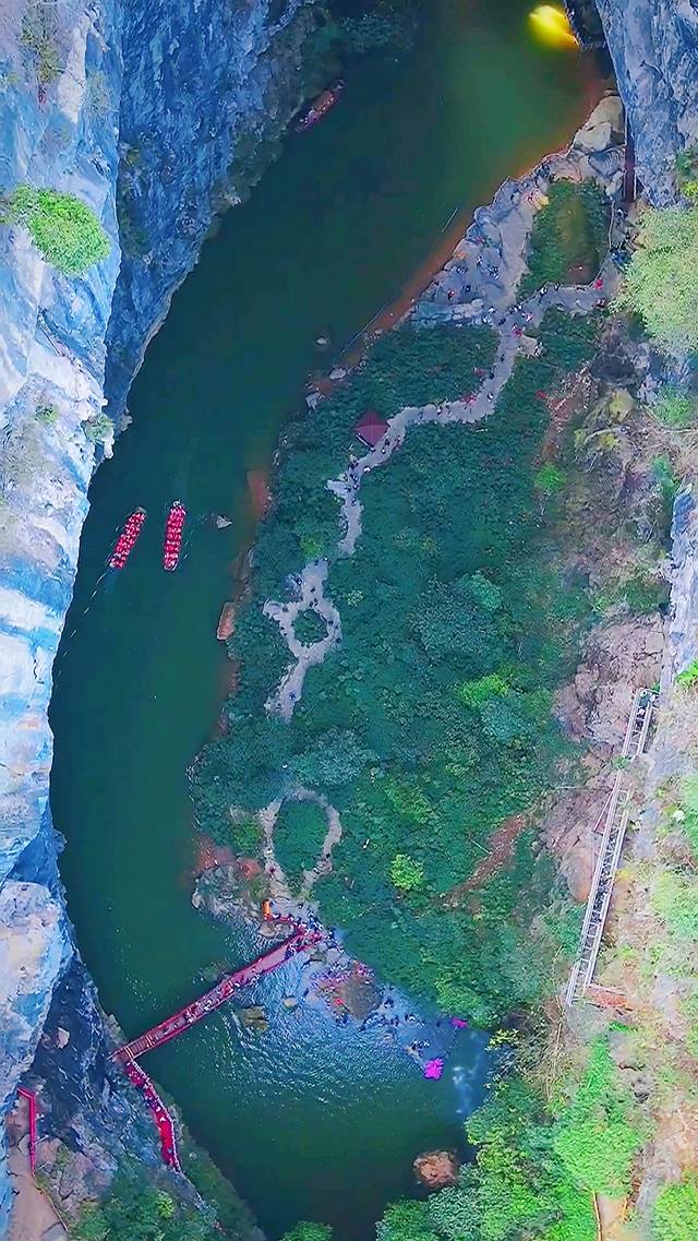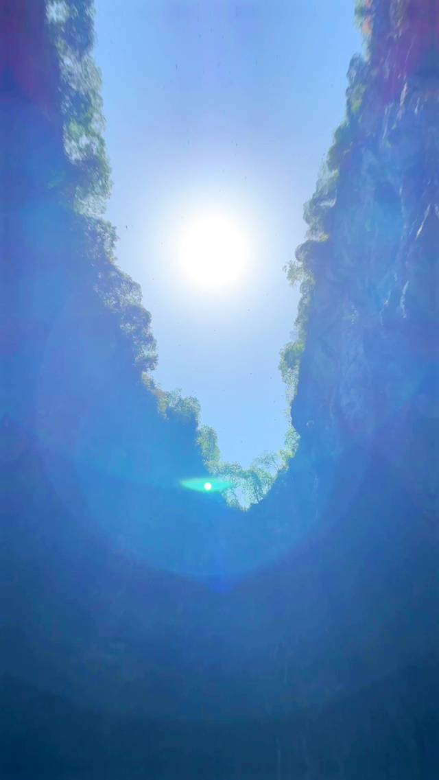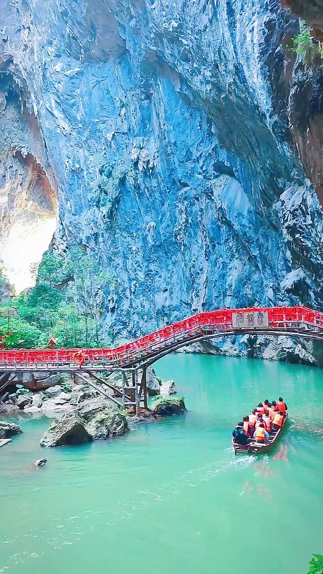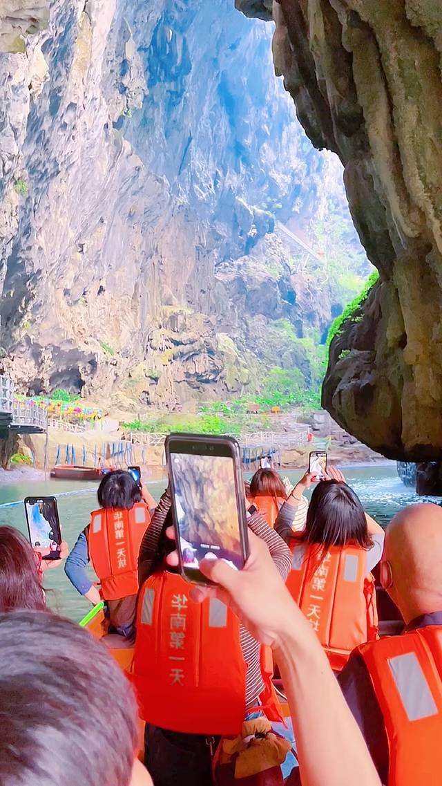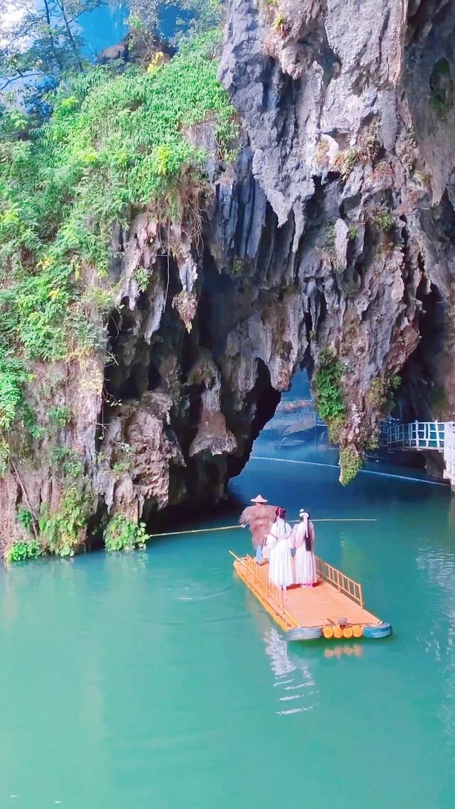 临近春节假期,我们汉服姐妹俩也换上了红色喜庆的汉服出游,船家带着我们泛舟溶洞天坑。一开始进去的洞口有钟乳石生长下来,挡住了大半个洞口,初极狭才通人,就是如此吧。船家身手敏捷,带我们穿过了钟乳石,进入了溶洞之后,柳暗花明又一村,果然豁然开朗啊!