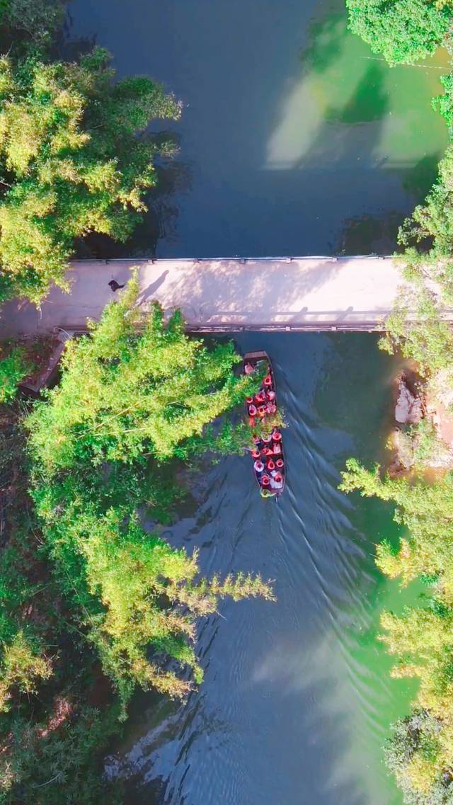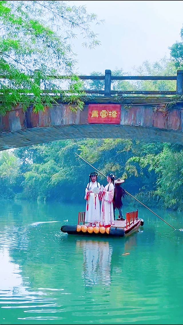 经过了姻缘桥,面前就是著名的仙境瀑布。瀑布前的亲水平台还有许多汉服爱好者在翩翩起舞,弹琴,摆姿势打卡拍照,仿佛来到了古时候一般,特别梦幻!后面船家又带我们游到了竹海之中,漫天的竹叶,就像繁星一般围绕着我们,竹林里新鲜的空气也让我们自驾开车的疲劳得到了缓解,这趟姐妹游果然没来错!