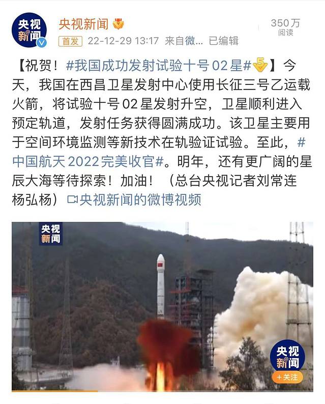 12月29日长征三号乙运载火箭,将试验十号 02星发射升空,它是2022年在西昌卫星发射中心完成的最后一颗任务。