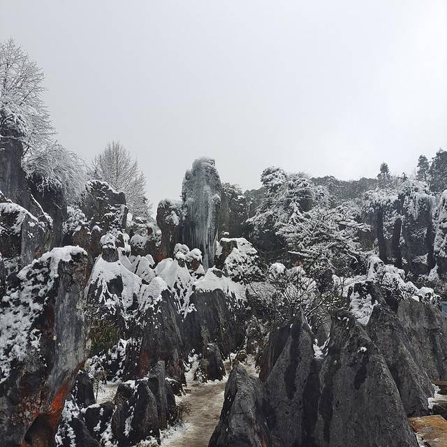 乘观光车上山,一层层白雪覆盖在地上、树上、石上,雪花和雾凇雕琢出一座座皑皑雪山,云雾缭绕在山顶,这时的华蓥山又变成了一个冰雪世界。