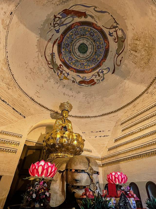 殿内供奉着普贤骑象铜像,此铜像比无梁砖殿历史更悠久,造于宋朝,是中国现存最大的古代铜佛像!当年普贤铜像铸成之时,还没有砖殿,只有木构的普贤大像阁。1599年,普贤大像阁毁于火。