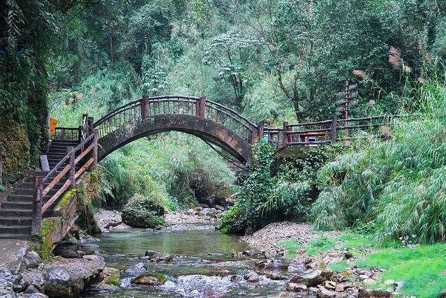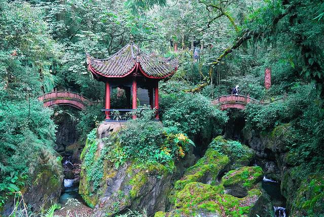 峨眉十景之一的“双桥清音“,中间一座丹檐红楼的亭子,亭两侧各有一石桥、分跨在黑白二水之上,形如双翼,故名双飞桥。右侧黑水,源出九老洞下的黑龙潭,绕洪椿坪而来,水色如黛,又名黑龙江;左侧白水,源出弓背山下的三岔河,绕万年寺而来,水色泛白,又名白龙江。这里一年四季,无论昼夜,满回荡着水声,这水声单一而清晰,加上两桥,故而誉为“双桥清音”。