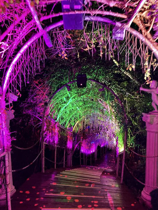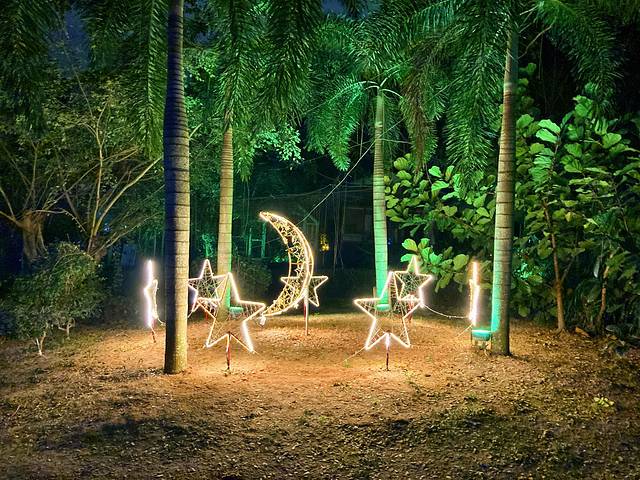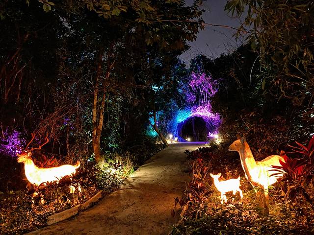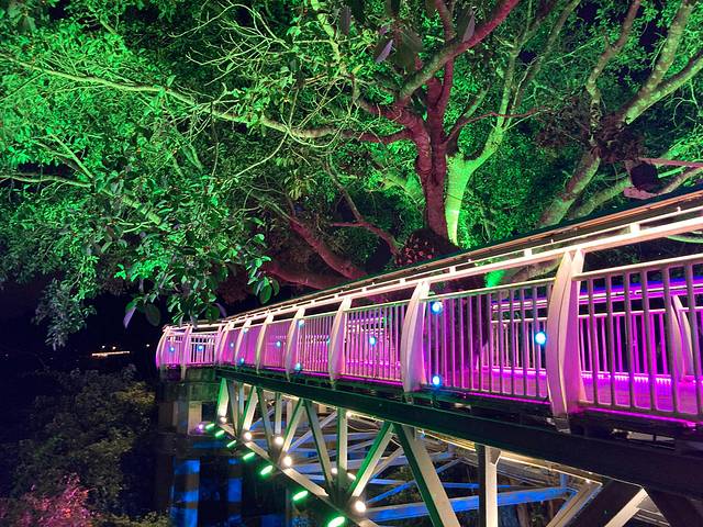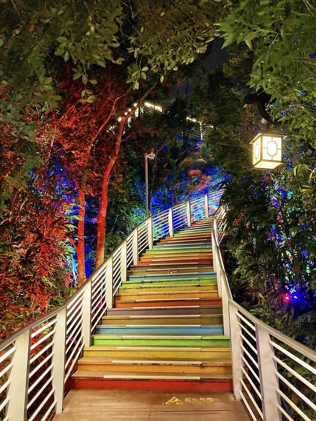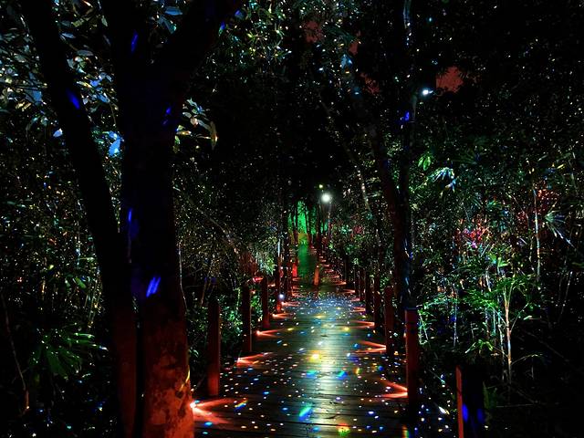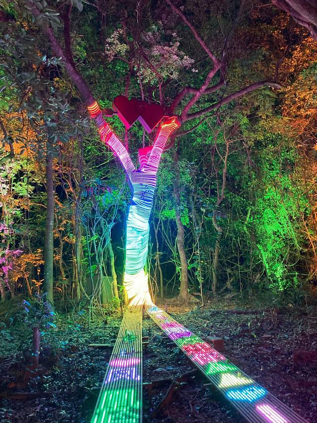 距离鹿回头非常近,是一个被大众忽略的景区,人流比热带天堂森林公园少很多。这里最佳的参观攻略是,下午5左右上山先看夕阳,等天完全黑下来看山顶的奇幻森林灯光秀。这个景区建在山上,是必坐缆车上山的,没有步道。灯光秀做的很不错,比一般的要花很多心思,入场左手走环绕一圈,比较大至少需要1小时,树上有鸟形和笼子形的灯,地上有可以互动的灯影游戏;树林里有灯光营造的萤火虫群,荧光草群还有播放灯光秀的屋墙;最远处是一座小型教堂,定点有彩绘玻璃的灯光表演;最后快要出去时,是一片网红道具区,有秋千、水帘、心形各种造型的装置。
