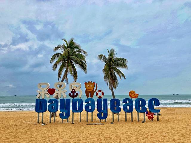 去呆呆岛在码头坐观光车,路程非常长。所谓的呆呆岛就是一片沙滩,在一侧有礁石山可以爬上远眺。沙滩比较大,沙子也细,遍布了不少网红道具,比如粉公交、渔船、各种牌子、画框等,这里的树林也能看到猴子,不过数量较少。