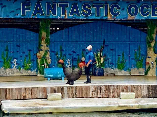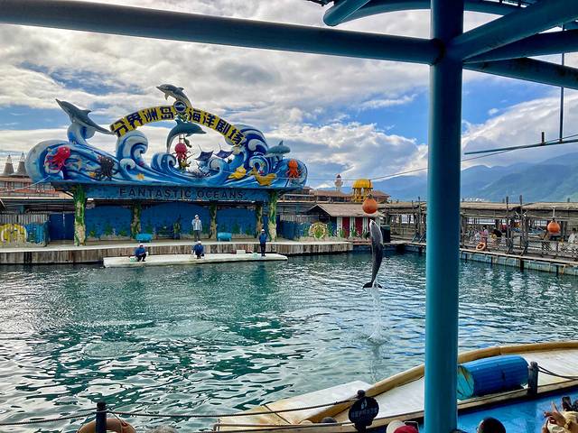 不建议坐观光车,需要参观的景色就到大冬天足够了,沿着海边走不到20min就到了,路上可以经过网红气球、跑车教堂、无边泳池,最后再观景台那里看看折返就行了,其他的景点就是看树林,哪都一样。表演当天下午只有一场15点,整体略敷衍,没在国内看过这种,比国外的查了好多,但聊胜于无。三只海豚只有一只表演了,跳了一次,海狮表演的比较多,时长总共大约30min。分界洲岛码头旁边的沙滩非常好,反而属于小众景点,沙子细人特别少,但是浪有些大,应该花时间呆呆。