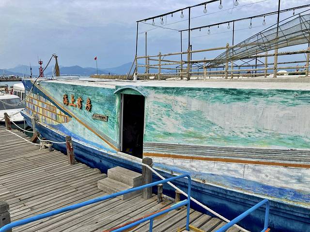 景区出口可以坐车去码头,这里的车去呆呆岛同样也是经过码头的,没有区别。鱼排参观的最后一班时间是14:30比较早,如果进景区晚的话,就不要买这个票了。鱼排观光船会在两码都接上客人才走,中途浪费20min,开到鱼排尽头就折返,然后会上到一个鱼排上面看石斑鱼等,可以喂食。这里有水盆装了螃蟹海胆螺贝河豚等,可以触摸互动,同时还有卖蟹粥青口海胆蒸蛋的,并不实惠但是特别新鲜。