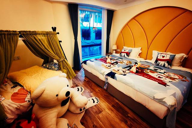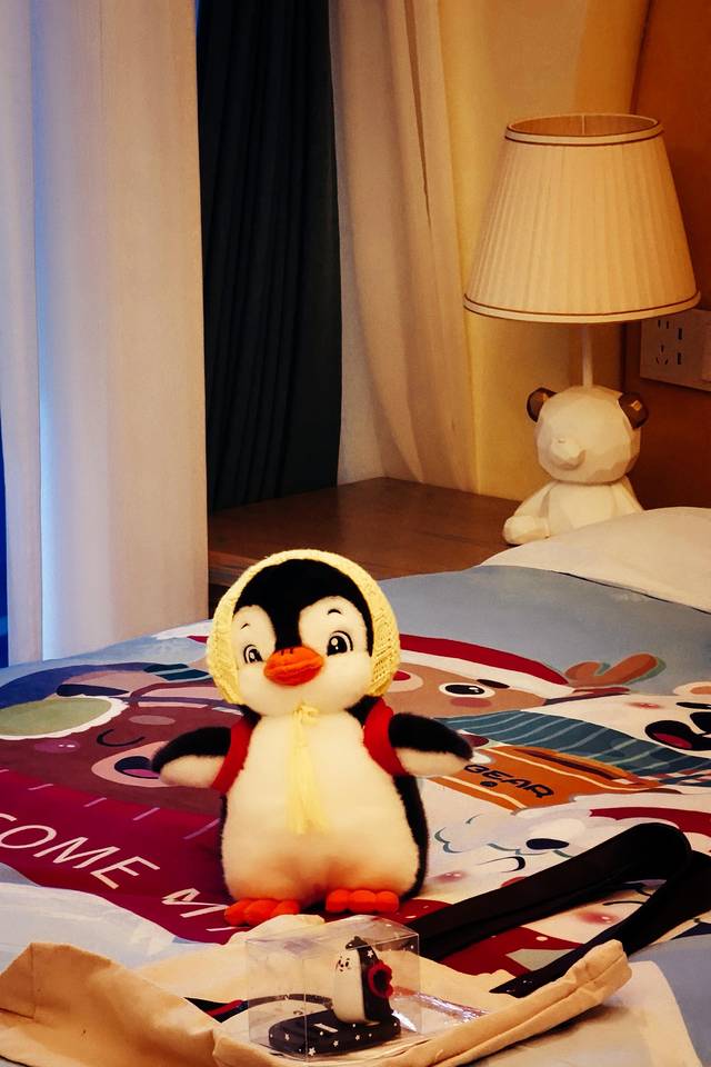 这是我的房间,入住就有酒店的吉祥物“逃学企鹅”等小礼品赠送,房间内还有一只超级大的北极熊玩偶。房间不大,但是超级温馨,有非常多的北极熊主题都体现在了各种小细节,带有北极熊LOGO的毛巾和浴巾,小熊造型的台灯,定制的北极熊主题的矿泉水,全套的北极熊主题的洗漱用品。