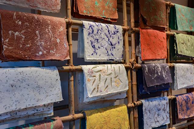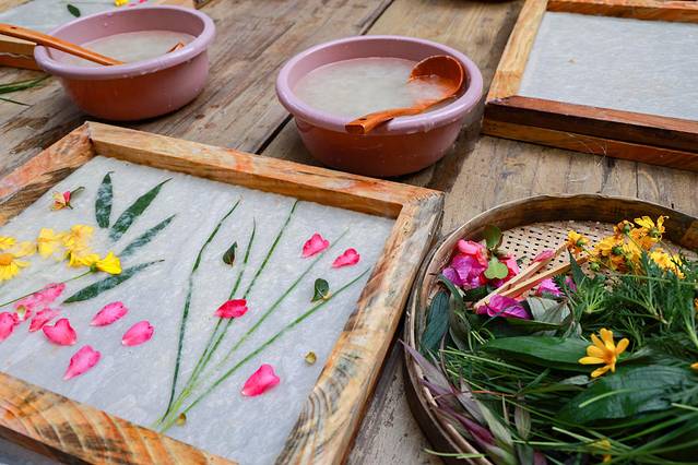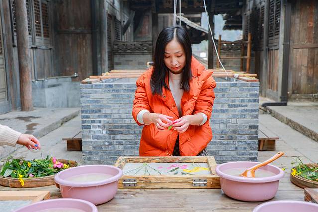 比如在乌纸坊就可以体验古法花草造纸的魅力,用勺子舀起纸浆,铺上抄纸,按自己的喜好用花草装饰,经过晾晒,就可以制作出属于自己的个性精美花草纸。