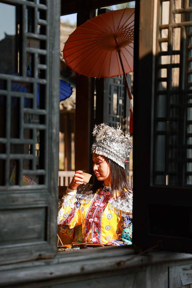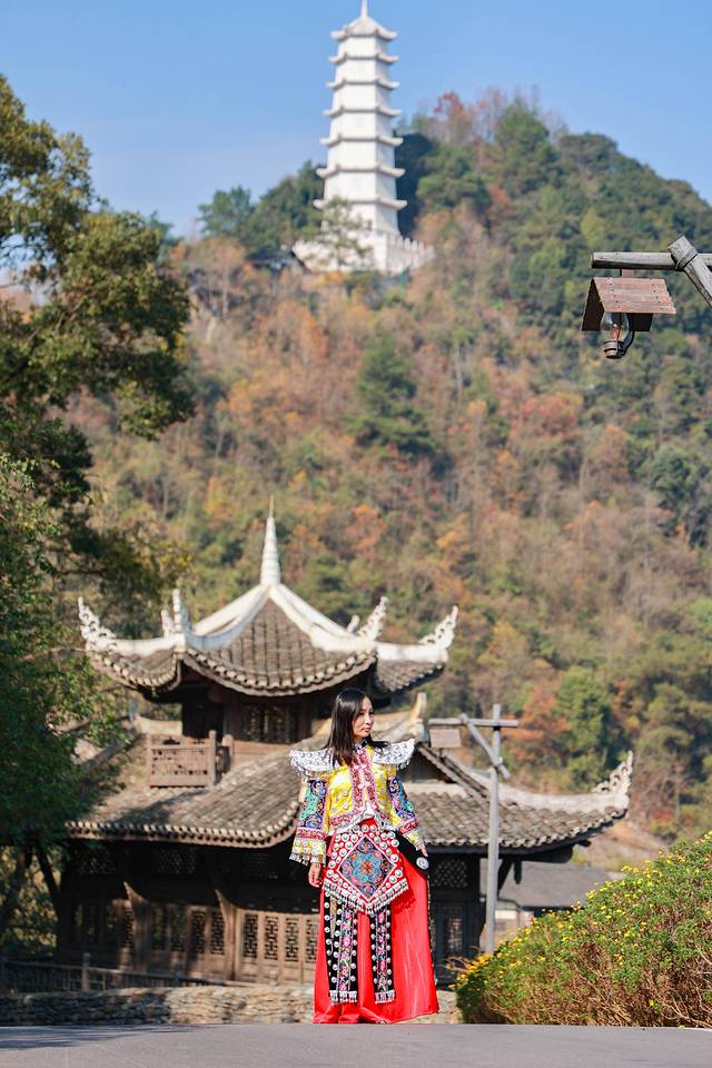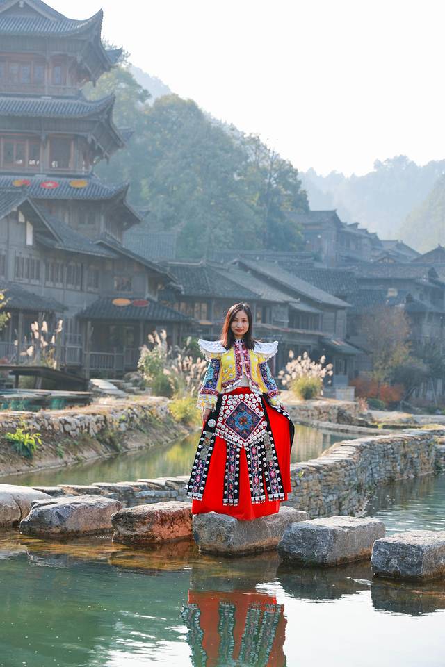 来乌江寨,爱美的女孩,一定要换上当地的民族服饰,下榻的黔书院酒店正好有免费的换装体验,所以我也穿戴一齐,当了一回苗族阿妹,体验了一次苗族风情。