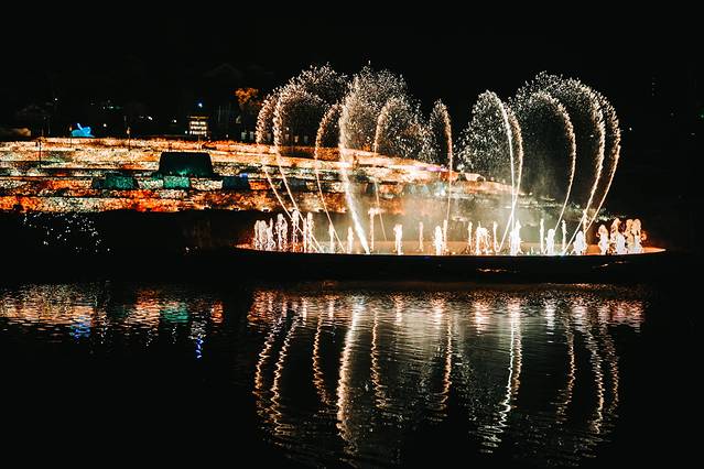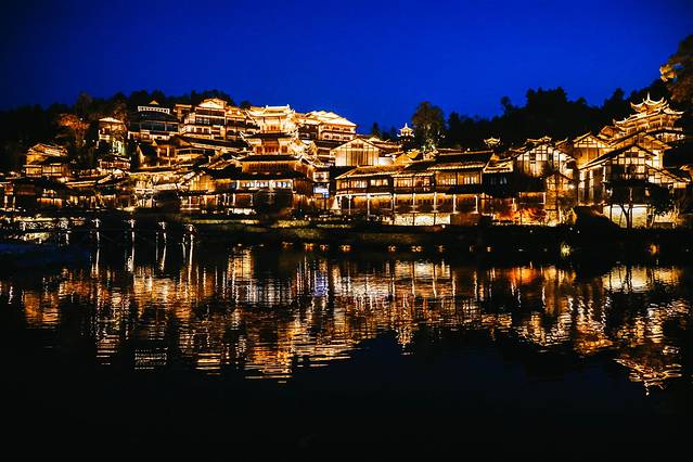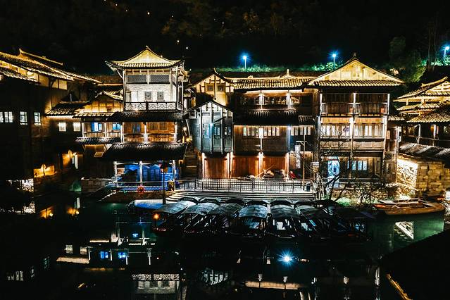 如果说白天的乌江寨两岸青峰,白塔隐隐,清新典雅,那么夜色中的乌江寨,在灯光的映照之下则似换了模样,金碧辉煌有如琼楼玉宇,亦如仙宫神阙。