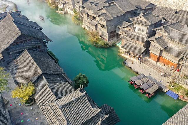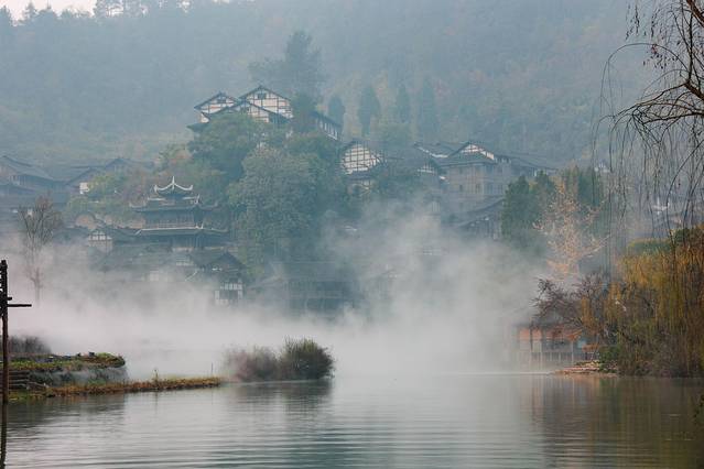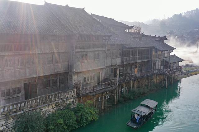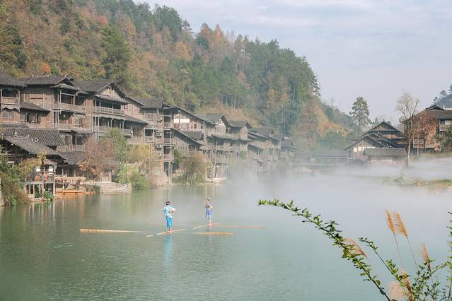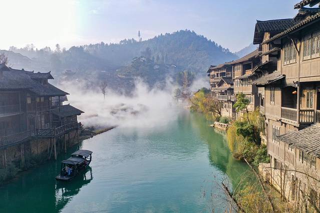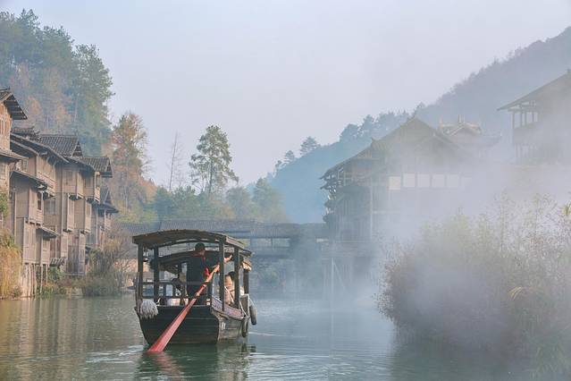 近处的民居吊脚楼,远处的群峰黛山,烟雾缭绕中如置仙境,一尝人间烟火,甘露沁人心脾。船夫不紧不慢的轻摇摇橹,水波轻荡,雾气蒸腾,交织一起,仿如画卷,景不醉人人自醉,闲适一天由此开启。