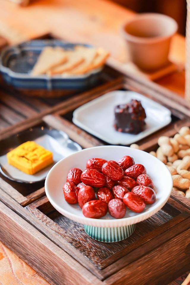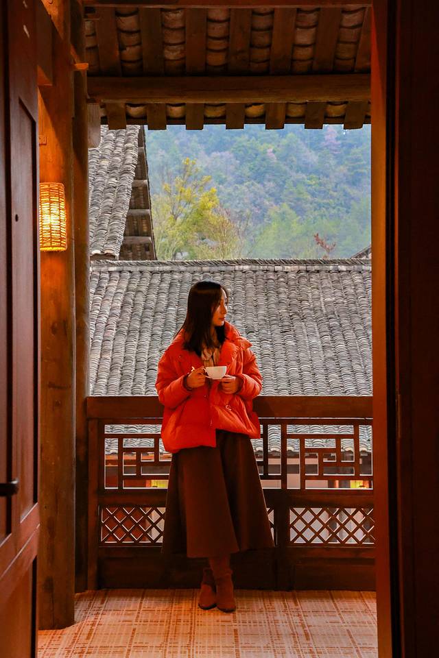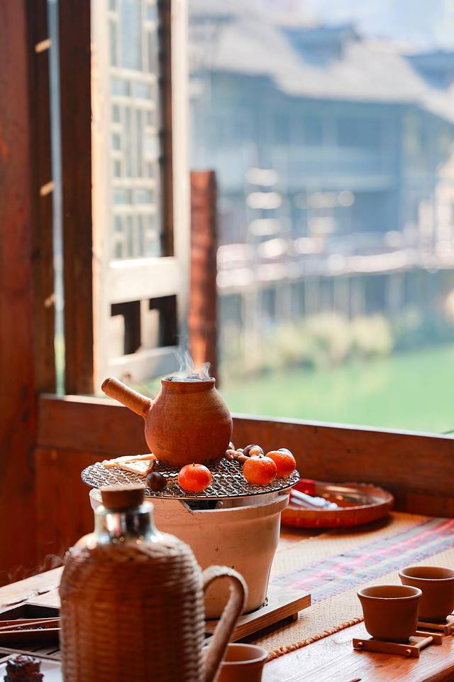 乌江寨的炎黄茶馆里有时下最流行的围炉煮茶元素,还未进入,就闻到里面温润的茶香、夹杂着烤红薯的气息,选了靠窗的河边坐下,茶馆的小姐姐给我们端上红泥小炉,竹编果篮等等,生起炭火煮上一壶热茶,茶炉边烤上红薯、柿子、柑橘等小食,冬日氤氲的松弛感和人间烟火气顿时充满了整个茶馆。