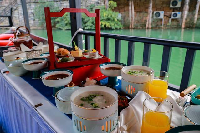 没想到是在游船上,享用了我们抵达乌江寨后的第一顿早餐,清晨9点,来到太乙阁码头,不大的摇橹船的上,已经铺满了一桌早餐,从热乎乎的米粥到色彩缤纷的色拉,琳琅满目,还有浓稠的红豆汤,养胃养颜。
