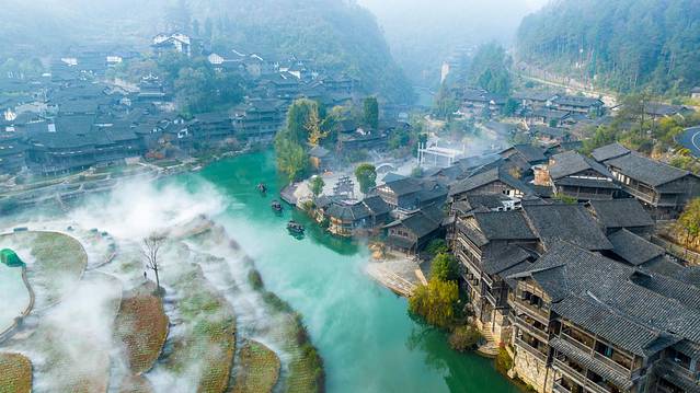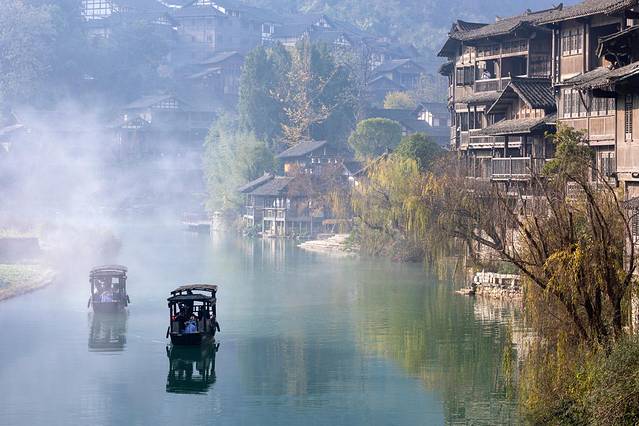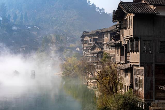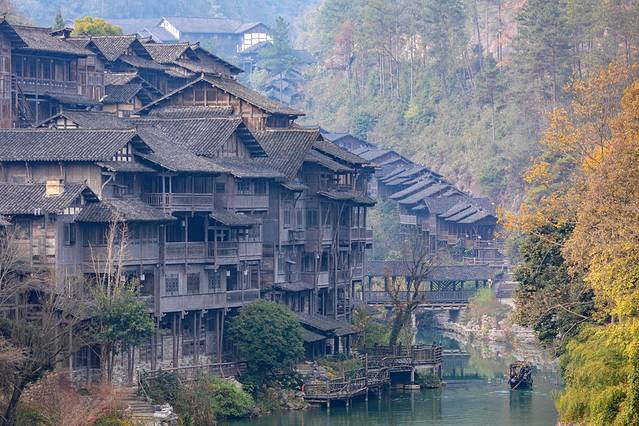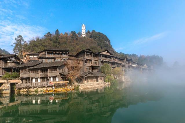 晨曦微露,风清鸟鸣,山涧之间云雾缭绕,在太乙阁码头坐上一艘摇橹船,穿行在氤氲水汽之间,鳞次栉比的吊脚楼扑面而来。