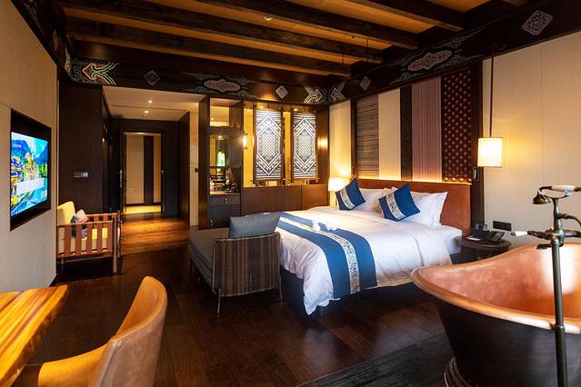 苗王酒店以苗族文化为主要建筑背景,拥有乌江寨最美的观景视角,躺在房间的浴缸里,就可以看到乌江寨的全景,在阳台上就可以欣赏水舞秀和无人机表演。