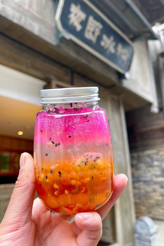 两旁招幌林立,香味扑鼻,雾隐龙抄手、赣南炒粉、紫霞仙子羊肉粉,夜郎冰粉,摆手饼以及撵狗串(烤肉串)等特色小吃让人目不暇接、口水直流。