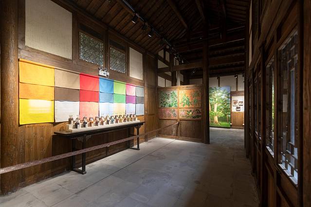 和平染坊前店后坊,作坊内展有黔北蜡染的工艺流程,后院晾晒着蓝白的蜡染布料,这里还可以体验亲手制作蜡染。
