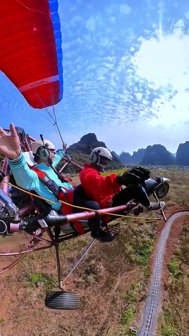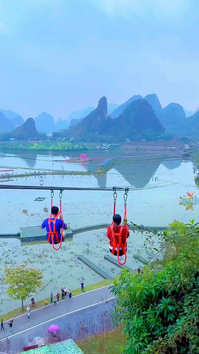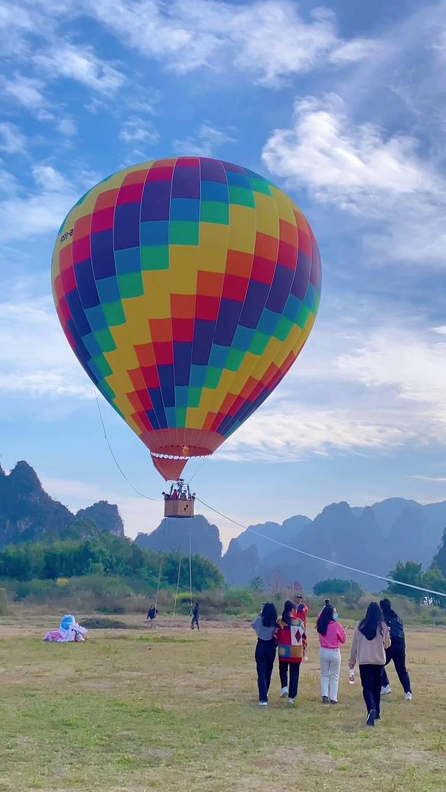 然后我们又去挑战了热气球。孩子只要做好防护,也是可以尝试挑战的哦。和孩子一起乘上热气球,升到半空,俯瞰了整片英西峰林的喀斯特山脉美景,荷塘倒影了峰林的雄伟,仿佛一秒钟穿越到桂林山水一般。