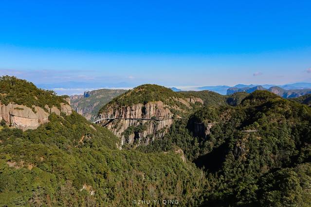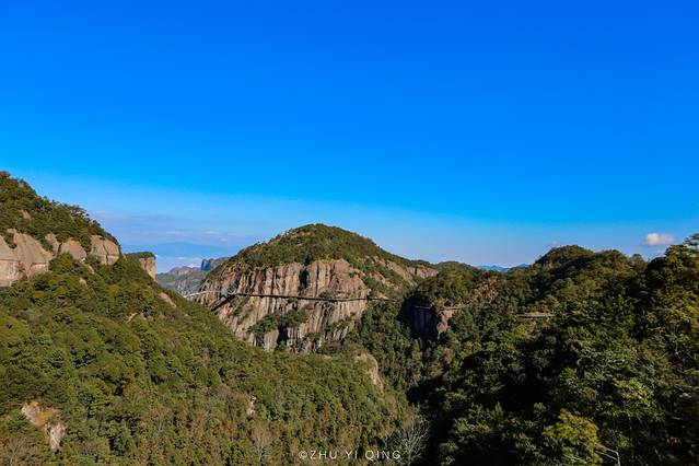 神仙居山峰以峻峭奇丽著称,一座座高耸的山峰孤高屹立难以攀登,处处都是美景,却也是峻峭奇丽,所以山岭间凿了不少悬空栈道。走在悬空栈道边,惊险又刺激。