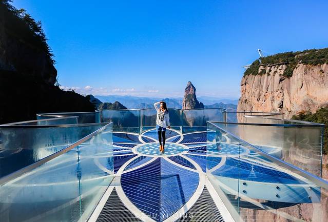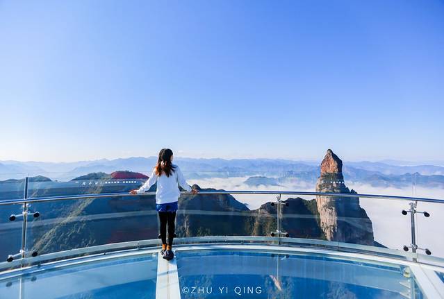 南天顶玻璃观景台位于悬崖峭壁之上,是单塔斜拉悬挑双层钢结构玻璃观景台,塔高30米,悬挑45米,悬空400米,玻璃平台分为游览观光层和运动体验层。当我站在观景台上,不禁感叹不虚此行。