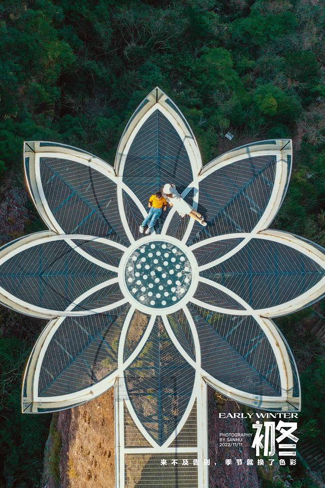 莲花台的设计也很有意思,中间花蕊部分用了玻璃建造,花瓣部分是不锈钢网,走上莲花台,远眺天然形成的观音像峰,祈求新年 安康 。