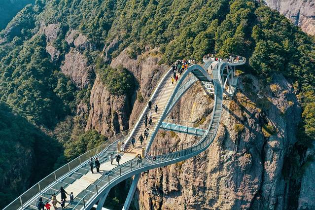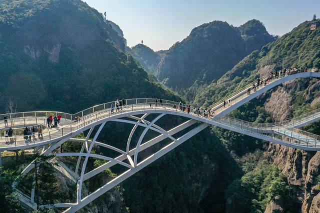 桥身用了弧形设计,和传统的桥梁设计颇为不同。走上桥上,两边是山间的美景。起伏的桥身,起伏的悬崖,如意桥既是交通用的桥,也是来到这里不能错过的美景。