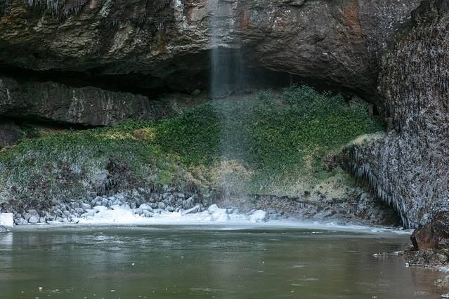 从山间悬挂而下的瀑布给山崖披上了银色的腰带,山崖上有薄薄的结冰,更给瀑布增添了不一样的色彩。