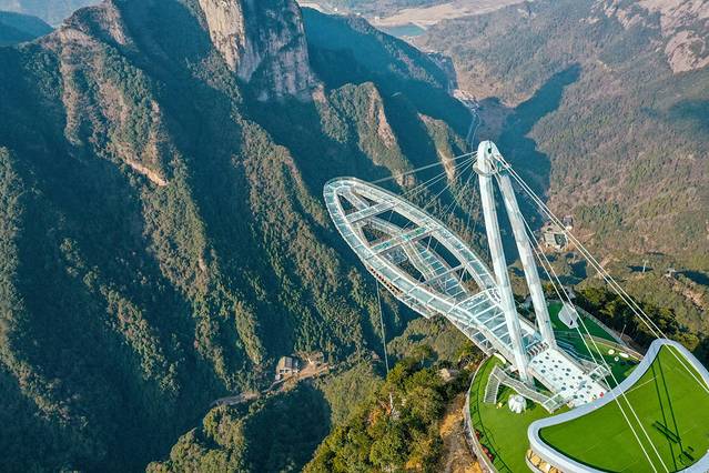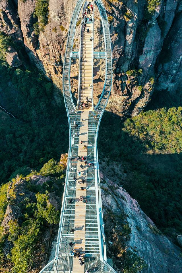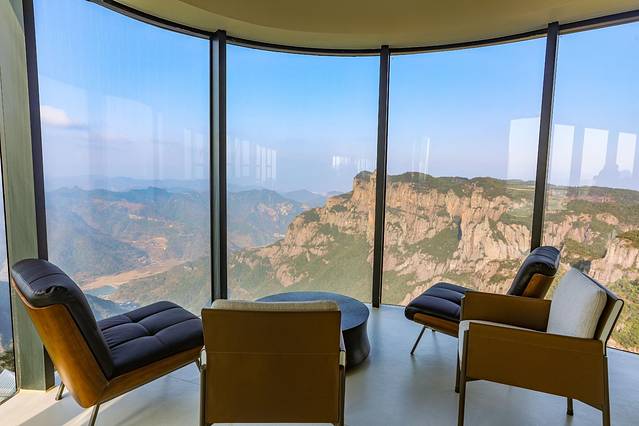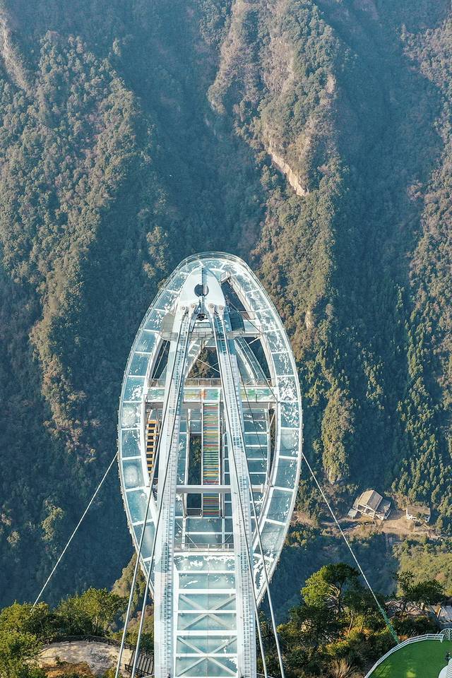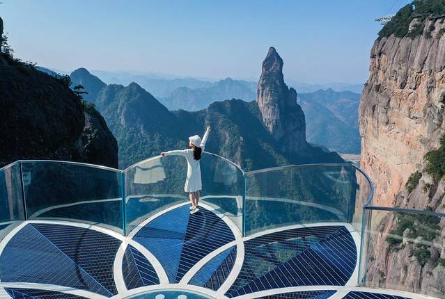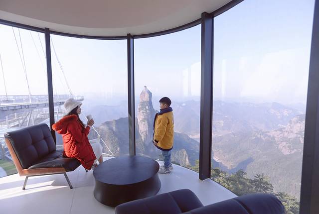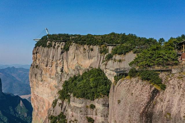 南天顶玻璃观景台位于 浙江 台州 神 仙居 风景区海拔869米的悬崖峭壁之上,形如太空飞船和远洋游轮,寓意扬帆远航和一帆风顺。