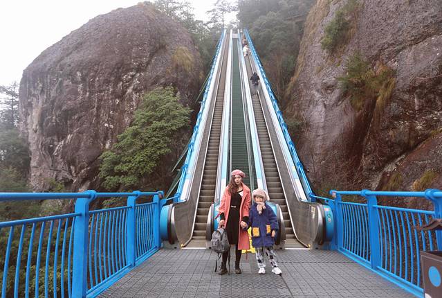 下了索道,还有一小段路设置了扶手电梯。坐上扶手电梯,一路往上,扶手电梯的风景和索道的景观颇有不同,但却同样雄伟。