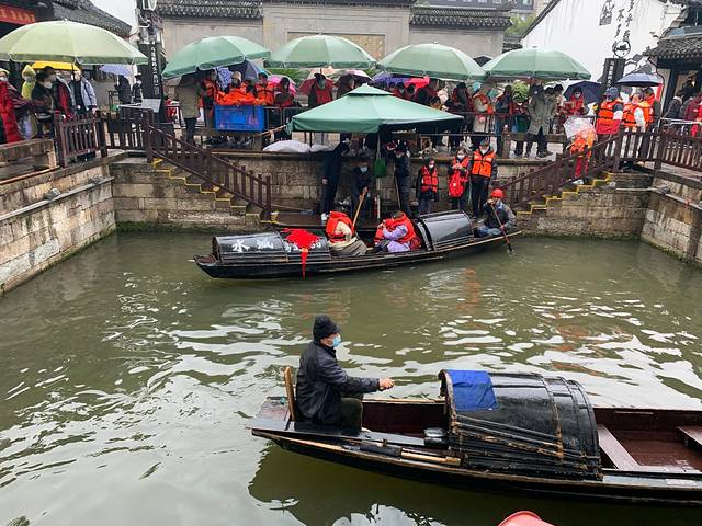 故居门口的乌篷船码头,队都不知道排到哪去了。