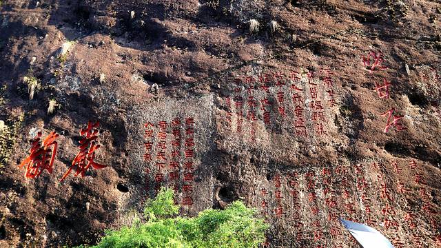武夷山玉女峰位于九曲溪二曲溪南,因其酷似亭亭玉立少女而得名。玉女峰突兀挺拔数十丈。峰顶花卉参簇,恰似山花插鬓;岩壁秀润光洁,宛如玉石雕就,乘坐竹筏从水上望去,俨然是一位秀美绝伦的少女。玉女峰与大王峰隔溪相望,像一对脉脉含情的恋人。东侧的圆石如镜,像玉女梳妆台,壁间“镜台”二字,是武夷山最大的摩崖石刻。