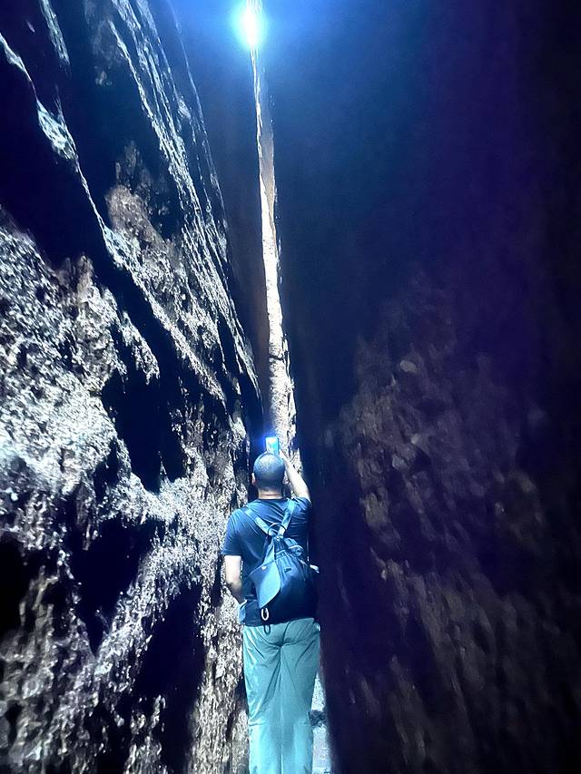 在一线天里,天光只漏一线,最狭窄处只有几十厘米,有戏言:“这世界上有四种人:直着过一线天的;侧着过一线天的; 卡在一线天的; 死活要过一线天,但死活被劝下来的”。