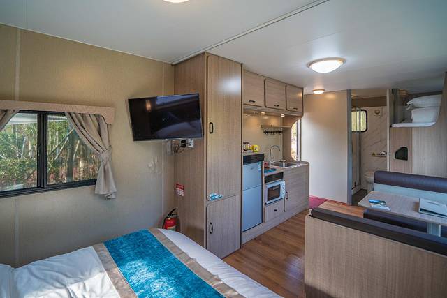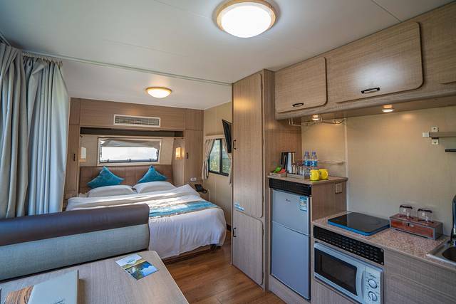 映翠湖房车营地主题酒店一共有50多辆房车,每辆房车内部都是按标准化的酒店客房标准进行装修的,有单独的儿童上下铺,适合亲子。