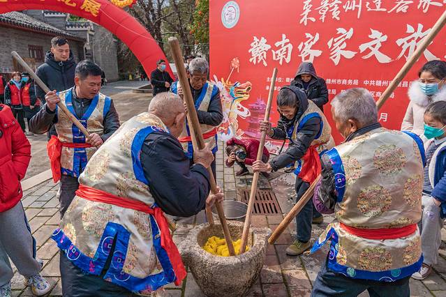 在活动的现场,还有非遗展演和非遗集市。来自赣州各地的非遗技艺和传统民俗都被搬进了客家文化城。一起来的,还有美味的客家美食~在客家美食节,现场制作的客家美食也是非常地道。