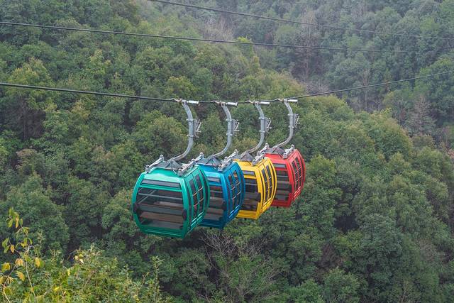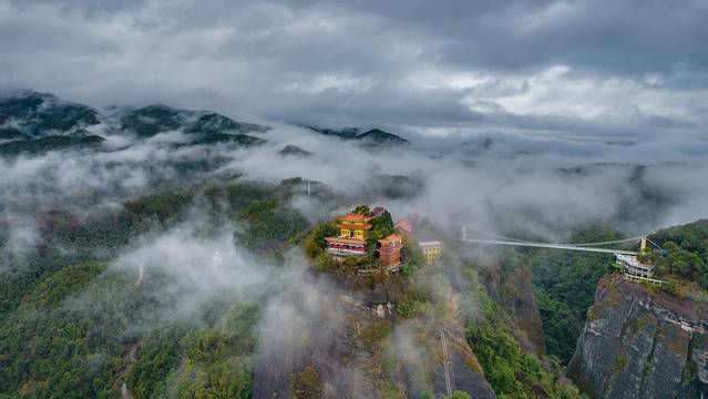 搭乘缆车上山,十来分钟的时间,但是可以节省非常多的体力就可以直达山顶。在山峰之上,有座400多年的古寺。两峰之间,是高架的玻璃索桥。雨后初晴,山谷间云雾缭绕,仙气十足。
