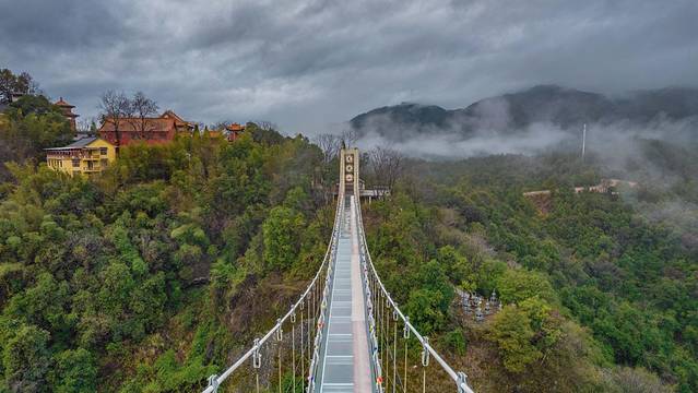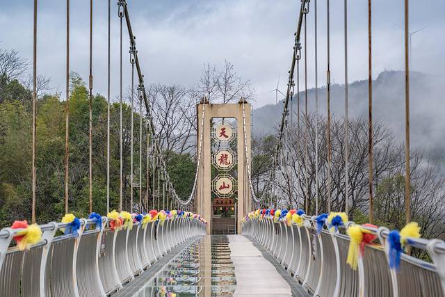 山上的古寺、玻璃索桥、天空之镜、大地之手都是拍照打卡的好点位。天龙山虽说不高,但陡峭的山体和四季不凋苍翠还是非常值得一看的。