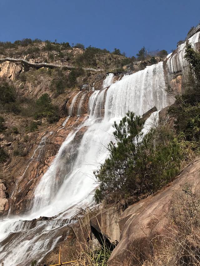 从国清寺下山,步行到景区大门打车去琼台仙谷,沿途经过桐柏宫水库,往左边道路前行。几年前去过桐柏宫,这会就不去了。到达山顶指示牌右边是琼台仙谷,左边是大瀑布,琼台仙谷与大瀑布是连着的,看着稀稀疏疏的,没什么人,原来是景区施工关闭了。那就转场大瀑布了。
