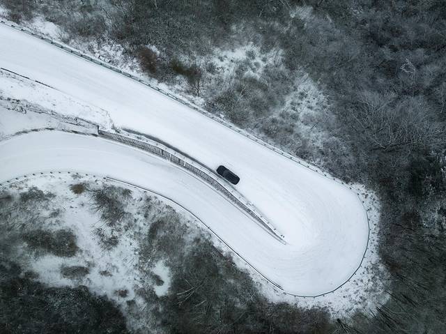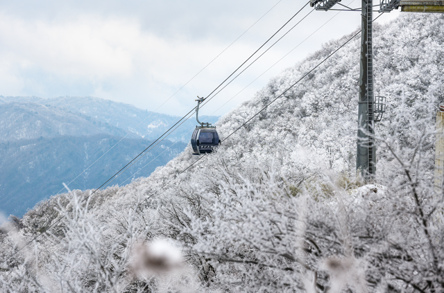 在香炉山索道内,向下俯瞰,山林沟壑间万物都被镀上了一层银白的花边,整个世界纯净无暇,浪漫又梦幻~