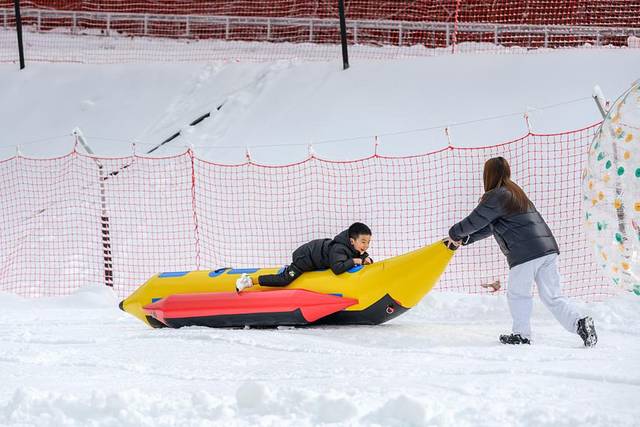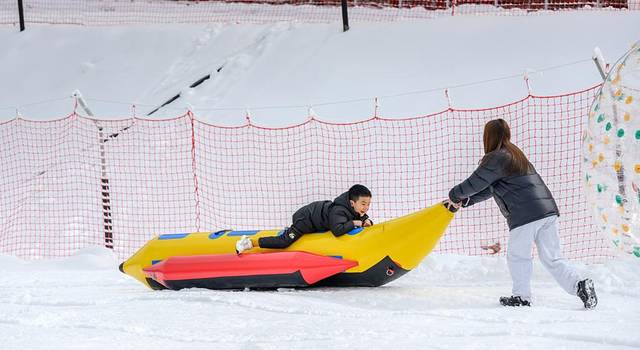 除了滑雪,大坝滑雪场的雪地项目也非常多,雪地悠波球、雪地香蕉船、雪地摩托、雪地小公牛等等,抢手的项目和迪士尼一样排队也要玩上好几轮,反正我这个大人是能玩疯的。