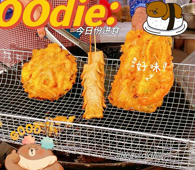 虾玛档就摆在码头边,是用粉浆包裹着葱,虾,鱿鱼等炸出来的,很香,很酥脆,必吃小吃之一