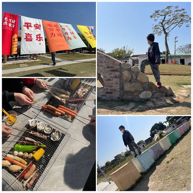 这场地真的好舒服呀,天气也刚好,不冷不热,大人在烧烤,小朋友到处跑,还有个飞机滑梯可以玩,80元一个烧烤位,烧烤材料自己带,包间可以唱k,打麻将,不自己烧烤也可以现场点烤鸡,烤番薯之类的,场景很好看,随便一拍,都是大片