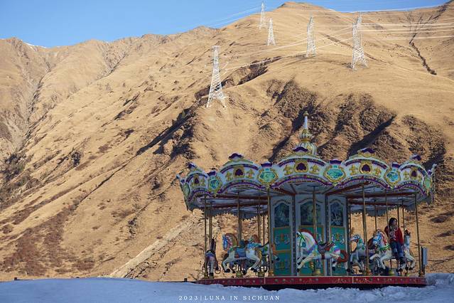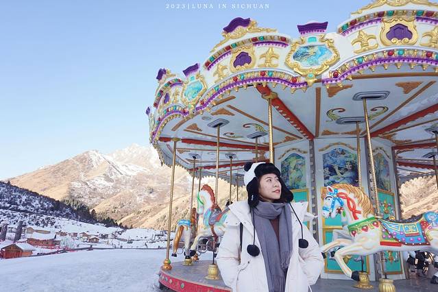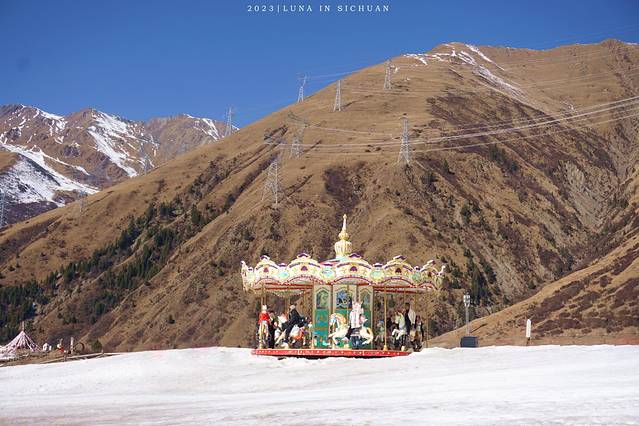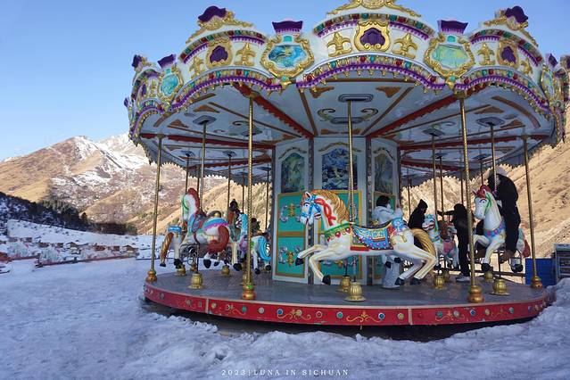 最受欢迎的,绝对是背靠着群山的旋转木马。是谁的巧思,把旋转木马和雪两者结合在一起的呢?它们有种既不搭又和谐的矛盾感,广阔的山脉和童真的旋木毫不沾边,但加上雪这个浪漫的元素,又显得是那么的梦幻。