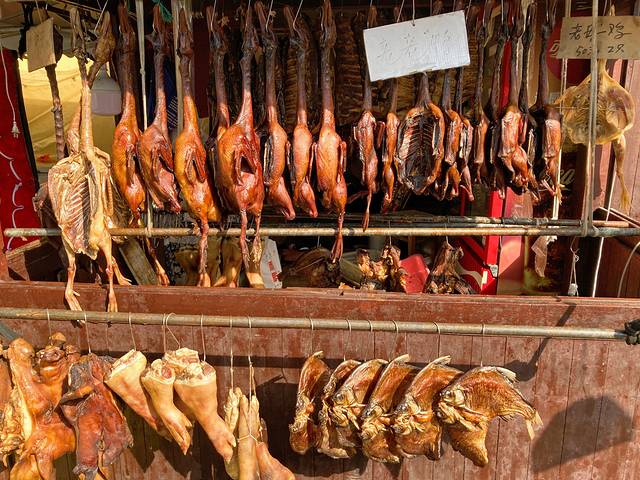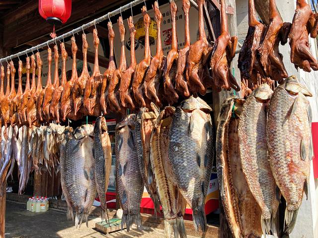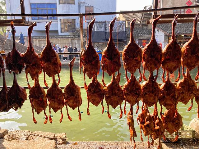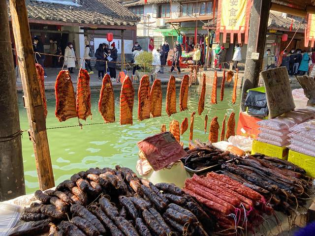 绍兴著名的四大古镇之一,差不多绍兴和杭州的中间,镇子规模比较大,一端到一端大约2km左右,本以为游玩时间不长,但缺错估了人流,众众众已经到了快要踩踏的地步了,主要集中在东侧入口和商铺街,过了一半左右人就少了,因为越往西主要都是民宿了。镇子始建于北宋时期,后多次焚毁重建,主街依河而建,北侧是商铺,南侧是民居,所以走南侧通行较快,而北侧几乎走不动。如果不想走路,也可以坐乌篷船,但是排乌篷船的队也十分之长。这里最有名的应该数酱货了,过节时,几乎挂满了各种酱鸭、酱鹌鹑、酱排骨、酱鱼、酱香肠、火腿等,种类十分丰富,还有各种小吃可以品尝,不过在镇内外,价格相差不多,砍价只看个人能力了。