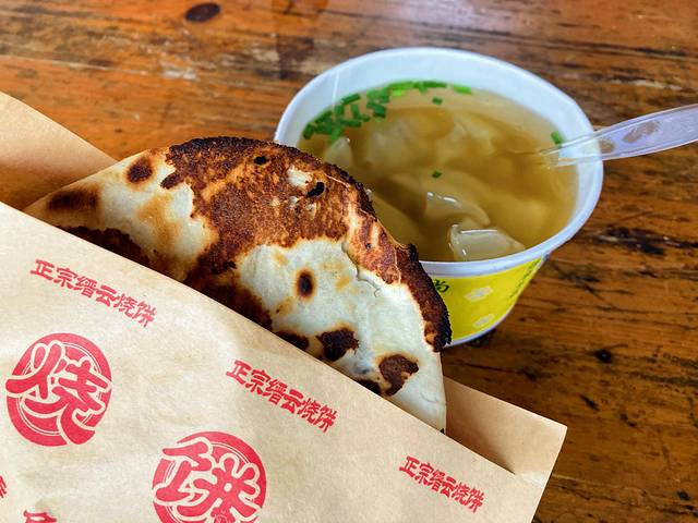 这家是仙都景区内的一个小摊,位置在朱潭山老翁牵牛过桥的一侧,是当地的特色缙云烧饼,价格当然是比较坑10元/个,个头看着很大但是比较薄,馅是梅菜干肉的但是不多,表层薄味道还不错,附加馄饨12/碗皮厚馅少比较差。虽然石景区价格,但仍可以很便宜的解决一顿午餐。