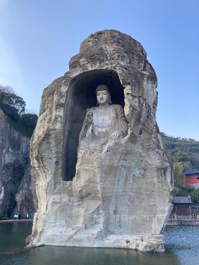 柯岩,进大门后走到游客中心区域,右手边是这个景区的大门,春节免费,但是门票需要去大门反方向游客中心换,十分不便。景区是个狭长形,在鲁镇的北侧沿岸,长度和鲁镇差不多,景点基本集中在东侧,也就是大门入口区域,有大佛、普照寺、岩壁上的题字等,往西走则类似普通的公园,有议席雕塑建筑,西门出去是码头,可以去鉴湖或者完乌篷船,跨过河则进入鲁镇的最西端。