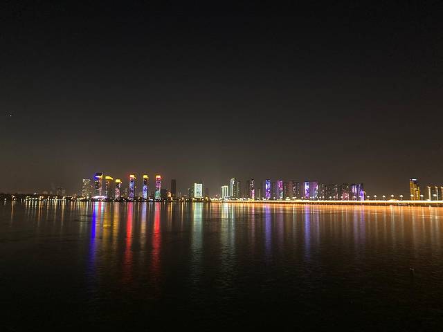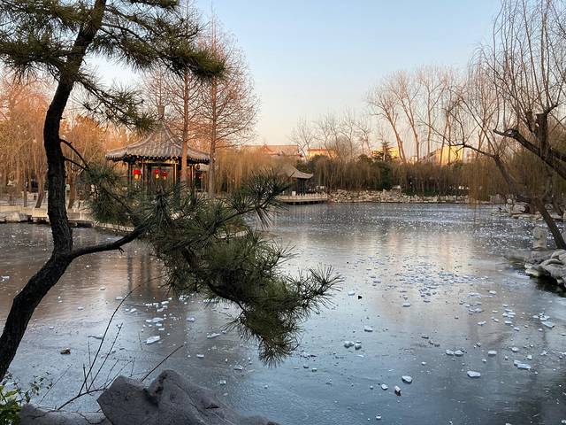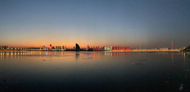 实际去的并不是滨河景区,而且它对面的河边免费公园,相对景区而言,对岸可看岸边的建筑灯光秀,而且滨河景区只能看到小区高楼的灯光。这个公园特别大,基本沿着河边建了三四座桥的距离,是一个非常大的绿化带,由于沂河比较宽,看对岸的建筑相对较小,不过灯影映射在结冰的河面上也是另一种风光,不同的大桥灯光也不太一样,算是个散步的好去处。