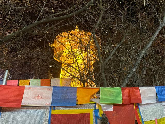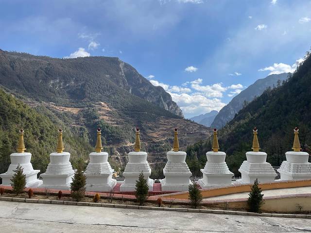 当天飘着若隐若现的小雪花,十二点多坐的景区车上山。大概会停五六处吧,开始是停在一个点观山;然后是一个类似小寺庙,门口好多白塔;第三个点没记错就是回音壁?可以玩滑索,有小卖店(不供热食),在这里就可以选择是否继续上山顶“佛塔”(需另外买票)。