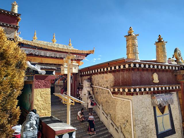 真没想到,跟前面大部分景点一样,这么近的松赞林寺也要坐景区车进去,也就是接驳公交,估计是为了给当地创收吧。车程大概3分钟?还是5分的。寺庄明洁净,金黑灰相得益彰,是在村的高处,附近都是民房。有的游客穿当地民族服装拍照真的好好看,有的不好。
