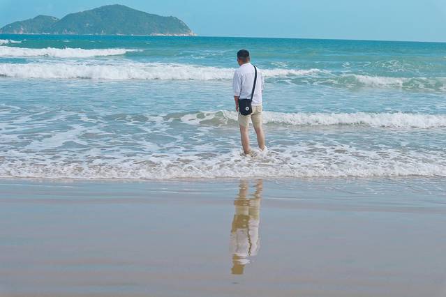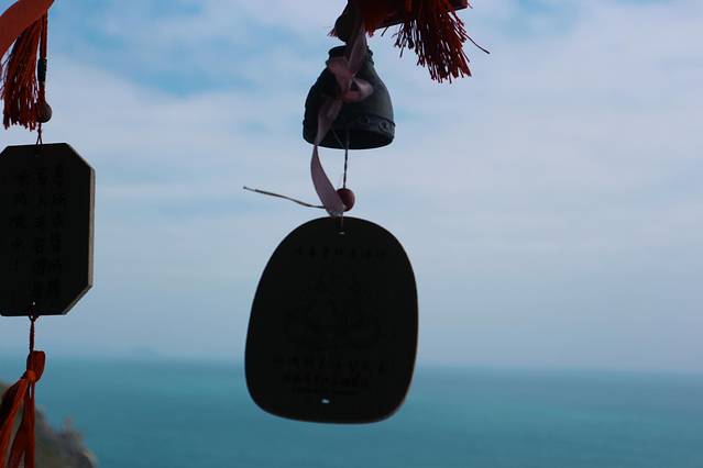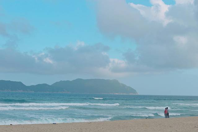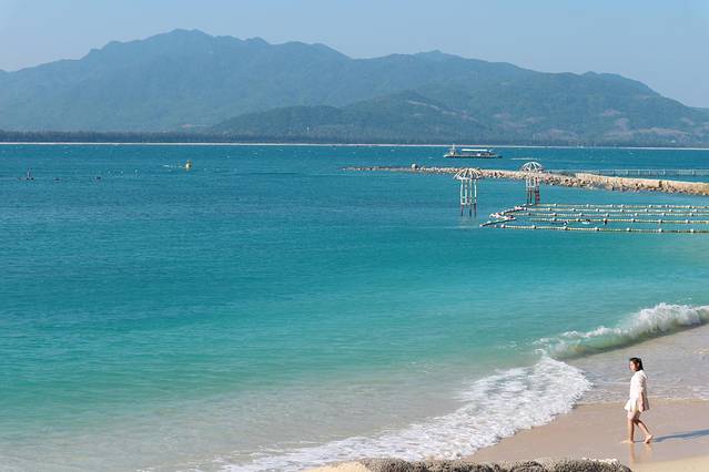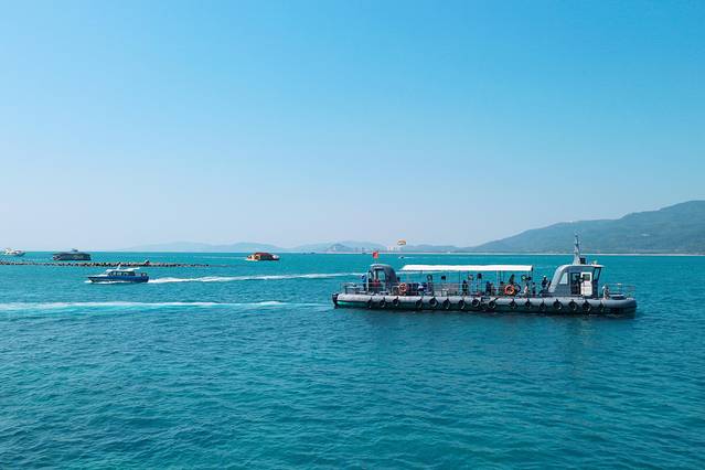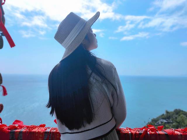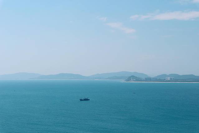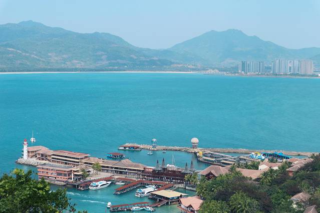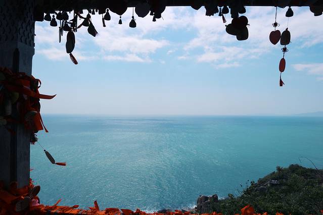 乘坐观光车登上小岛的最高点——欢喜堂,那里是一座象征着欢喜幸福的弥勒佛。许愿牌上留下旅客的心愿,被一声声许愿铃的清响,伴着海风,说给弥勒佛听。水天相接的南海,是一望无际的碧蓝。海风习习时,微波粼粼。近处是一次次撞击礁石的海浪,又在诉说着海那边传过来的愿望。